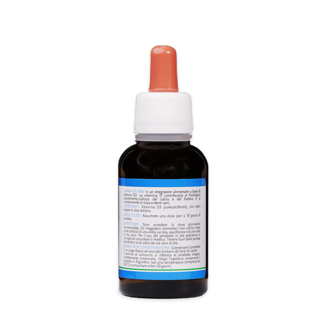 Suggerimenti per l'Uso: Savana D3 Raw è ideale da abbinare con un integratore di vitamina K2 per un assorbimento ottimale. Questo prodotto è disponibile in flacone da 30 ml, con 240.000 UI di vitamina D in olio extravergine di oliva bio italiano, che garantisce un'assunzione di 2000 UI per 10 gocce giornaliere.